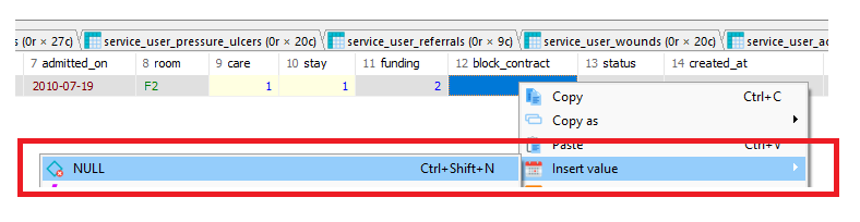 - Right click the cell/value -> click 'Insert value' -> click 'NULL':